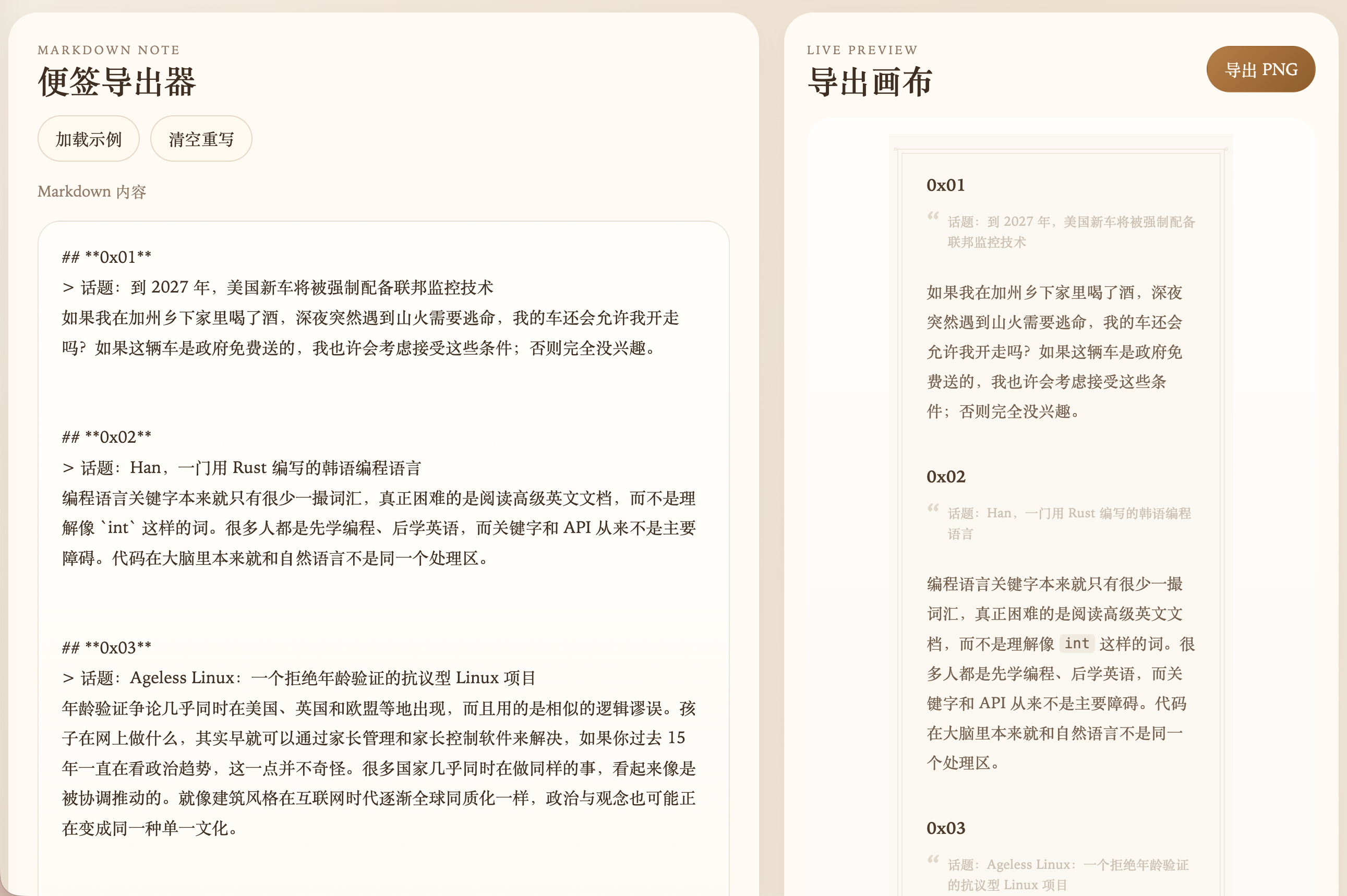 写了个 skill ,用锤子便签卡片,优雅导出 markdown 内容,给 openclaw 或支持 skill 的开发工具,输入以下文本即可使用