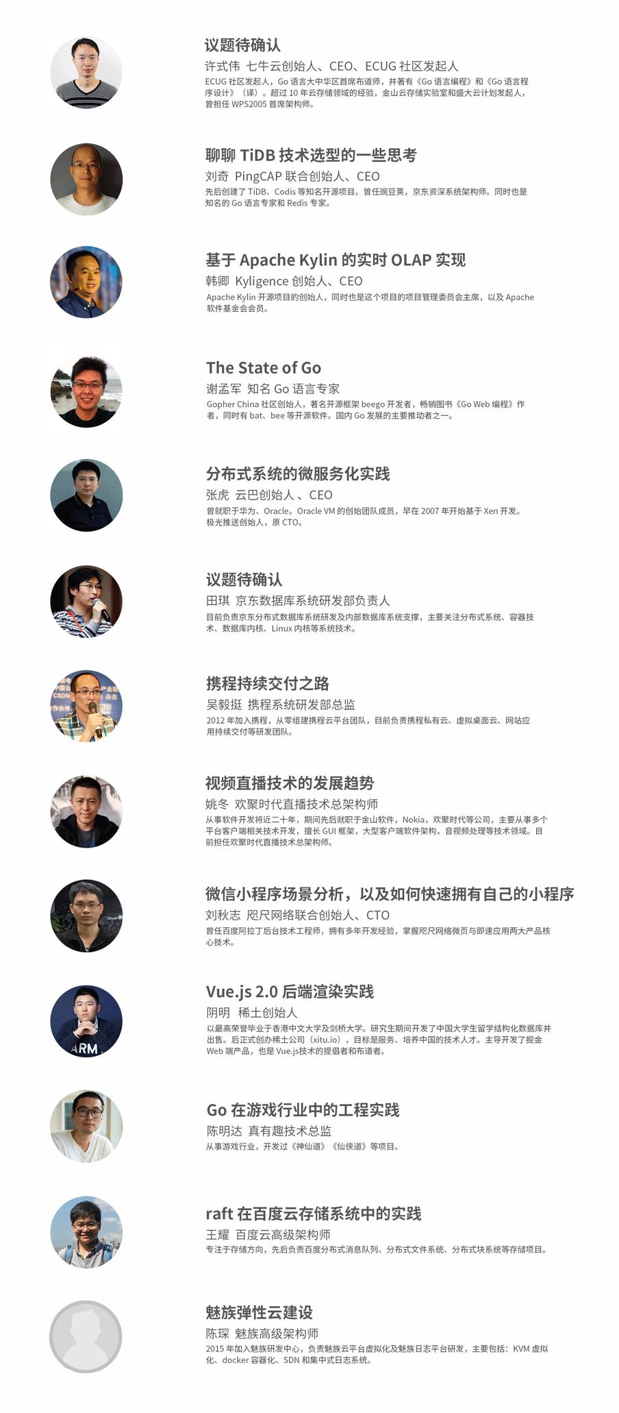 与历届 ECUG Con 一样, ECUG Con 十周年,大会仍然坚持以技术干货为导向,杜绝广告,专注于某个细分技术领域的实践分享,不求大而广,只求专而深,大会嘉宾和演讲内容都将由许式伟亲自把关。届时, ECUG 的老朋友,谢孟军、刘奇等将莅临现场,和众多的新朋友一起,给大家共同奉献一场云计算领域的技术盛宴。