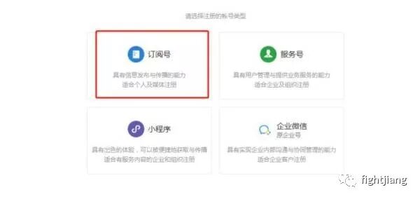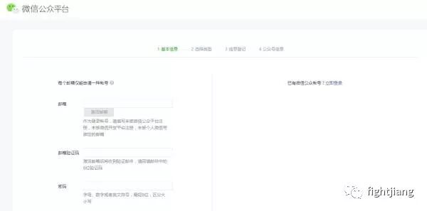 第五步:填完邮箱,手机号,身份证等信息后,就会到最后一步,公众号的设置: