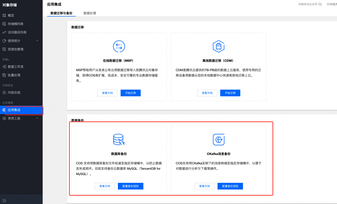 当前 COS + Serverless 入湖方案已集成在 COS 控制台的应用集成目录中,可直接访问 https://console.cloud.tencent.com/cos5/application 进行相关能力配置。