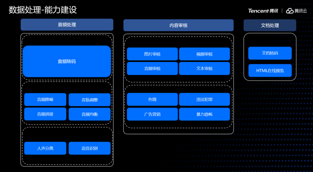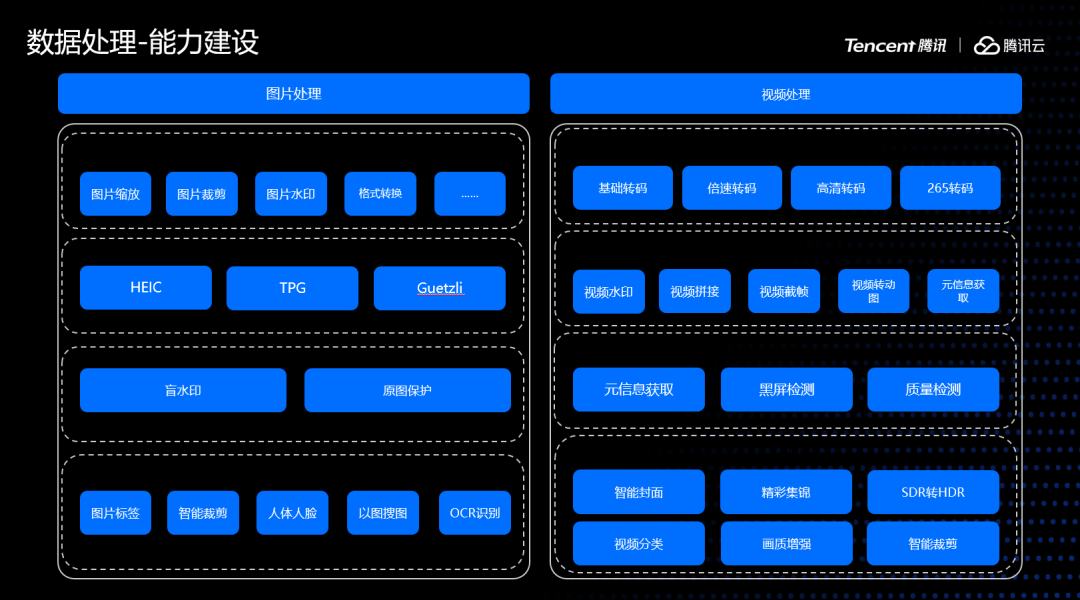 数据处理的底层是各种原子能力,包括图像处理、视频处理、音频处理、内容审核、文档处理等。除了对原子能力做持续的迭代和优化,腾讯云也关注业界前沿技术,保持对前沿技术的敏感性,在合适的时机尽快地应用到云上,服务客户企业。