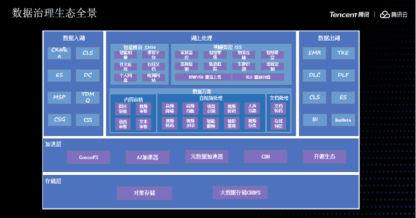 从对象存储数据治理生态全景图中可以看到,除了对象存储标准接口之外,还可以通过消息队列、结构化存储系统、视频流等多种数据源,将数据快速方便地入湖,湖上也提供了丰富的数据处理和分析能力,消除数据孤岛,实现计算存储分离,由于部署及架构等原因,在业务实践中也遇到了不少挑战:主要体现在 IO 性能、目录操作以及存算分离需要的大带宽上,针对这些问题,腾讯云对象存储作为数据湖的底座,提供了多级数据加速服务,以满足不同场景的需要。