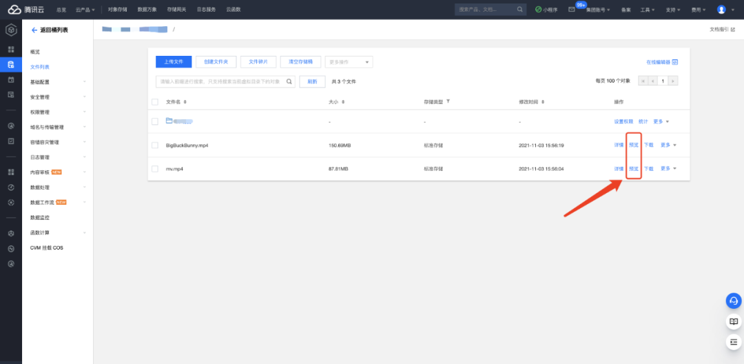 此外,COS 控制台还集成了视频的预览功能,您可以在 COS 控制台方便地预览您的视频文件。登陆腾讯云 COS 控制台,选择存储桶进入文件列表页,点击操作栏的预览按钮,即可进入预览模式。